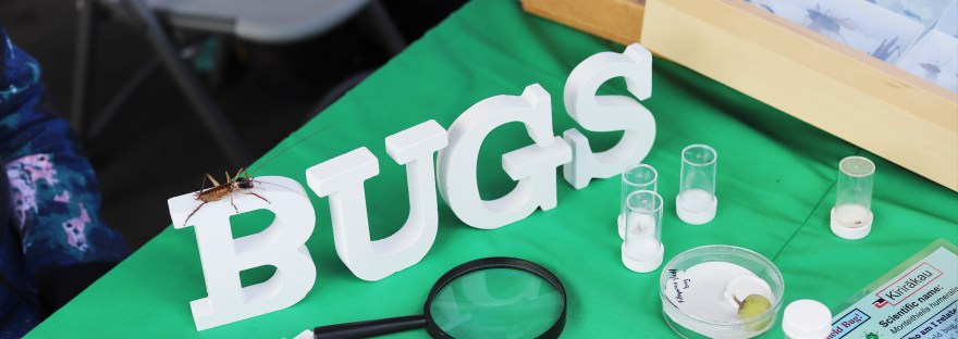 Our stall was called “It’s a Bugs’ Lab” and showcased a wide variety of bug themed activity. We had a selection of live native insects for the public to meet and potentially interact with. These were native stick insects, giraffe weevils, spiders, stink bugs and native/SA praying mantids. We also had boxes of pinned insects for viewing with a magnifying glass, a set up microscope where people can take a look at prepared slides, a poster where people try to find the hidden moth/stick insects/etc, and pin puzzles where kids could put together the life cycle of the huhu beetle or native praying mantis.
